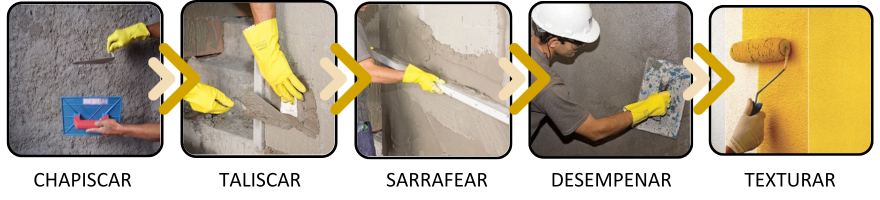 Iniciamos com a aplicação do chapisco (podendo ser o convencional ou rolado), em seguida, após o tempo de cura, começamos a aplicação do material com nossa mão de obra especializada e, por último, o acabamento é feito com uma desempenadeira lisa junto com o acompanhamento técnico da